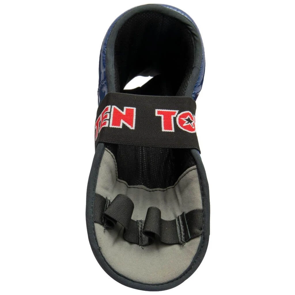 The new improved Top Ten Superlight Kicks now have replaceable straps. They come with replaceable industrial strength 2-inch-wide elastic straps with strong velcro ends, which means no more having to replace otherwise good gear just because the straps have worn out. A slightly lower cut design with a shorter tongue lightens the kick by around 10% compared to the original Top Ten Fight Kicks model and allows for a more comfortable use when wearing shin guards without reducing the protection level.