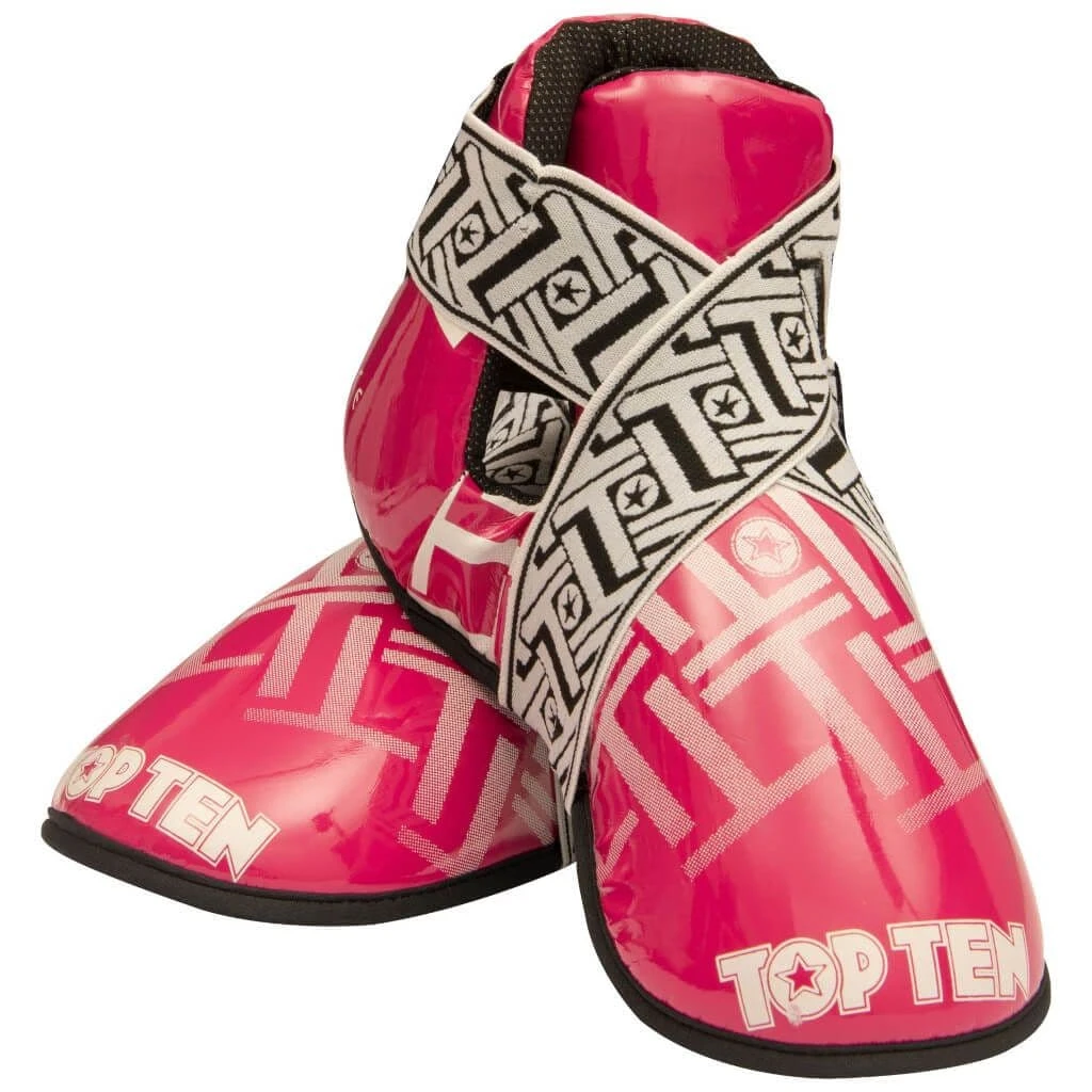 Especially in the martial arts disciplines with a lot of footwork and kicking techniques, like in Taekwon-Do or Kickboxing, you should put a lot of emphasis on the protection of your feet. The most heavily loaded part of the musculoskeletal system is the foot, especially on the top of the metatarsus. Top Ten’s “SuperLight” foot protectors are designed specifically for this area and combine with the latest medical and sports technologies to bring more safety to martial arts. The sturdy synthetic leather case is filled with an already pre-formed PPS foam and offers the athlete excellent damping properties with high energy absorption. For a long shelf life, Top Ten’s bottom edge is reinforced with a black contrast strip.